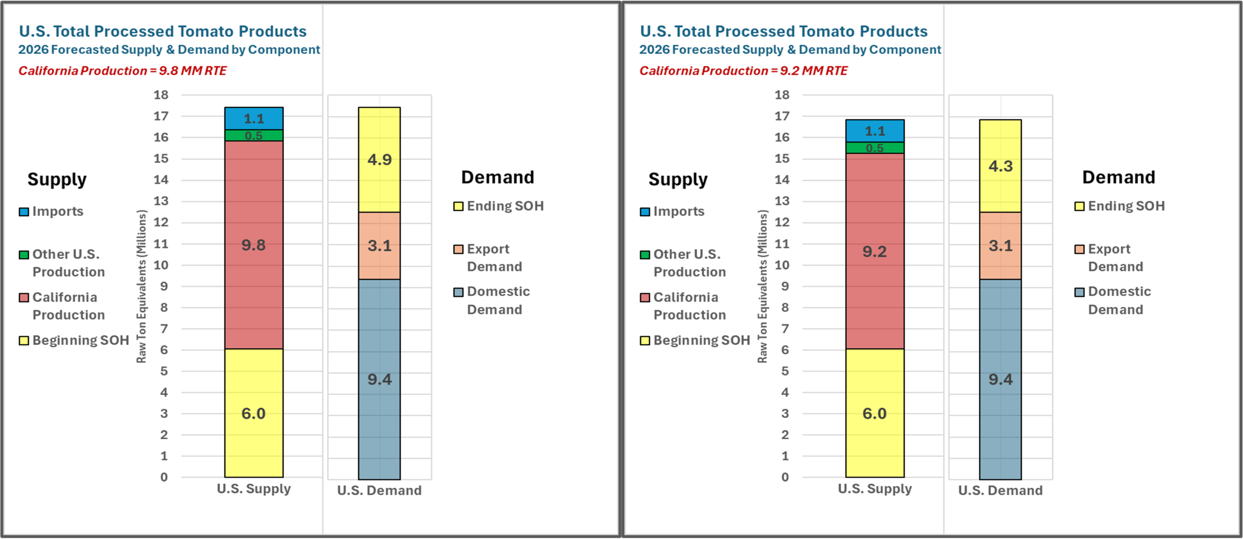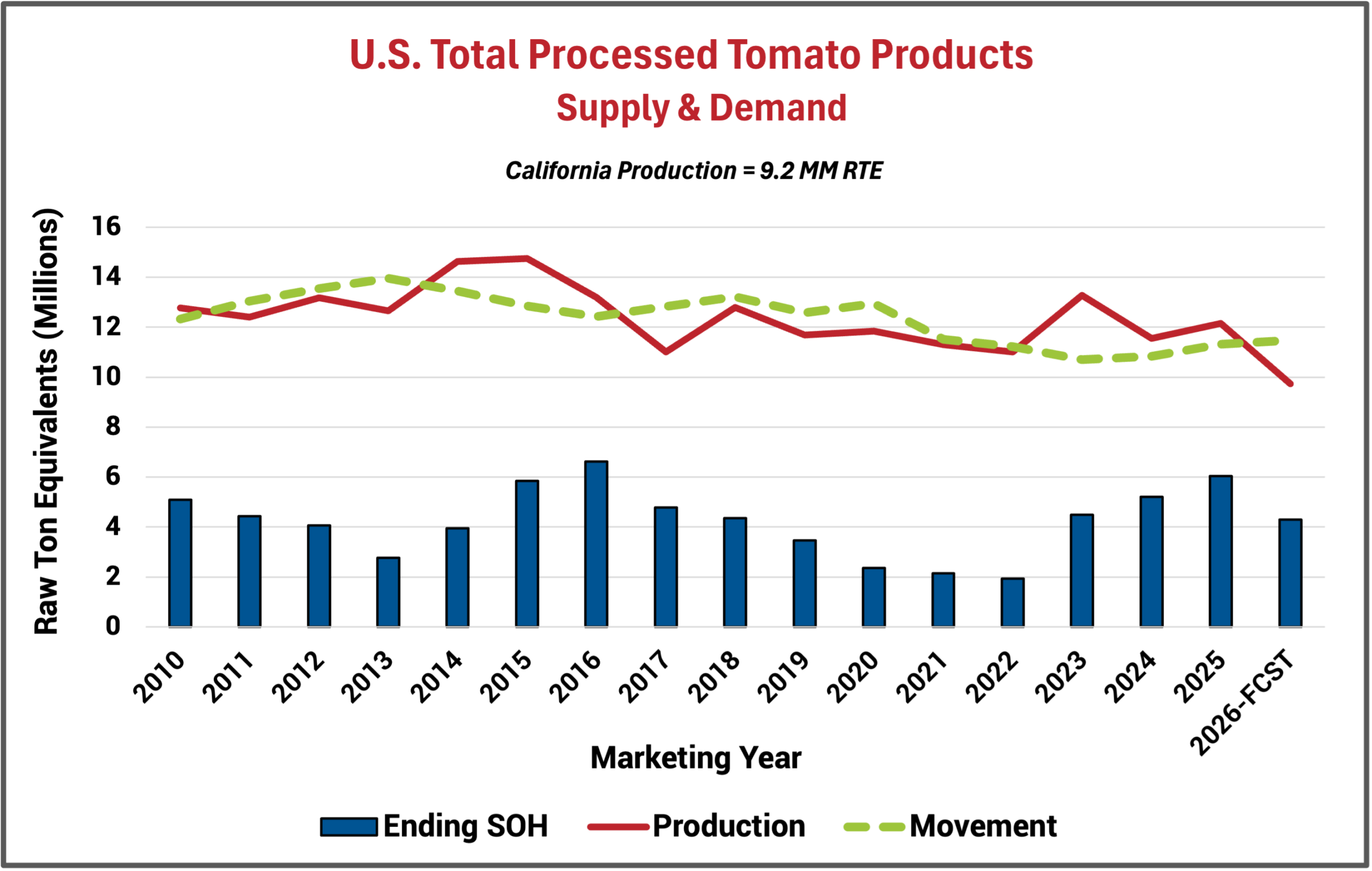 Part 3 centers on the supply and demand outlook for processed tomato products and the key planning considerations for the 2026 crop. With record production in 2025 leaving inventories elevated, planned tonnage for 2026 reflects a deliberate adjustment as the industry works to rebalance supply. At the same time, domestic demand remains steady, export channels show constructive momentum, and trade dynamics – including currency and tariff pressures – continue to influence competitiveness. By examining crop intentions alongside stock-on-hand data and movement trends, this section connects the numbers to the broader market balance heading into 2026.